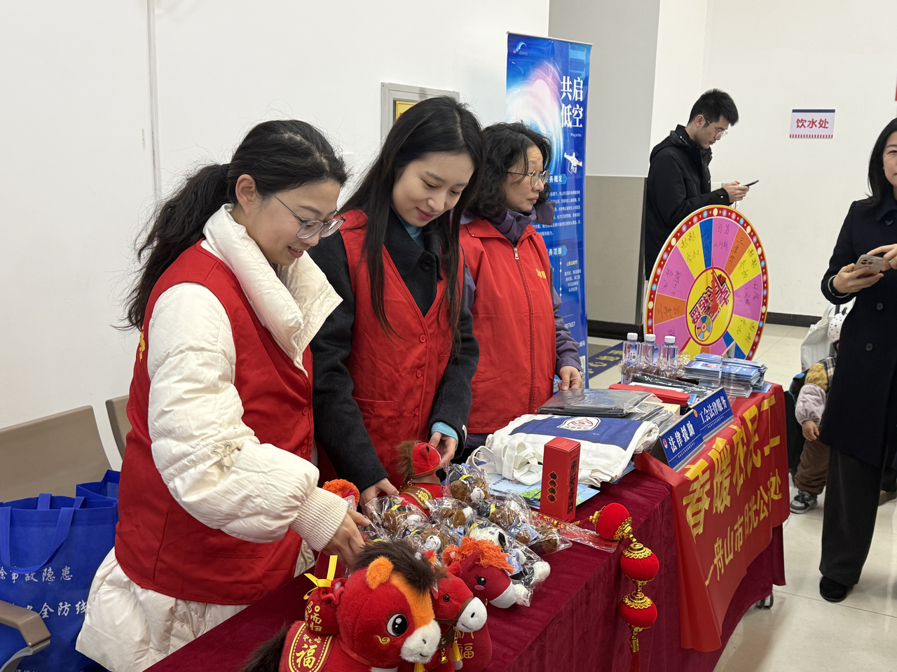 一旁的舟山市司法局服务点也化身旅途中的“法律加油站”,为返乡务工人员送上普法宣传与法律援助,让归途多了一重安心保障。