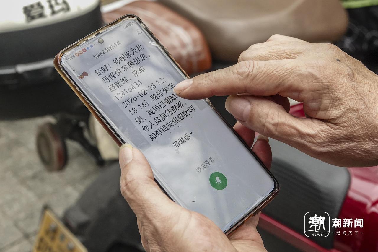 将丢失的小红车的车身编号信息发给杭州公共自行车平台,不一会儿,柴大伯收到了确认信息。潮新闻记者杨晓轩/摄