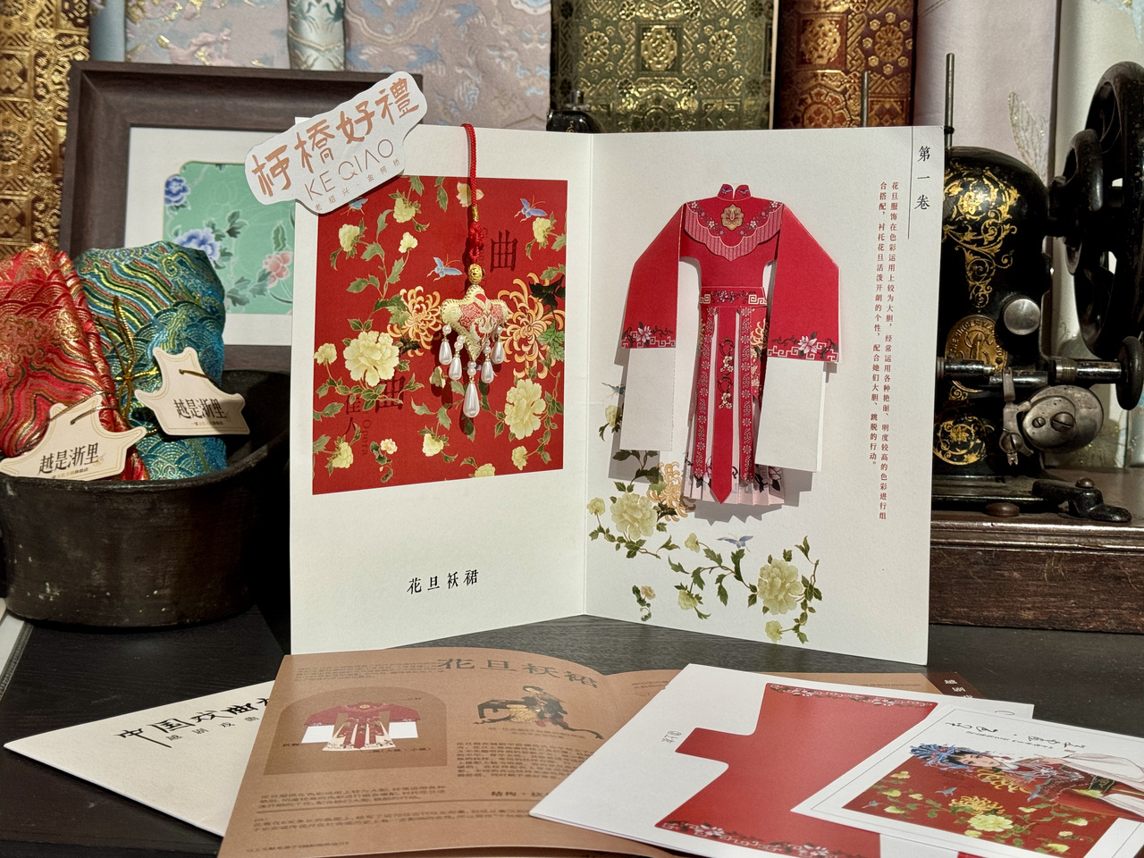 杭州余杭的《菓然有戏》茶点,将戏曲元素与非遗唐果子技艺结合,一口下去,是茶点的香甜,也是戏曲的韵味;细纹刻纸《弦牵花境》原创丝巾,用乐清细纹刻纸“细如发丝”的刀工为骨,将“梁祝”的浪漫以极简线条融入真丝肌理,千年传说与非遗匠心成为颈间温柔的穿搭;“越是浙里”织锦迷你靠DIY则从戏服制作中汲取创意灵感,结合绍兴特色织造技艺,打造了“一款中国戏曲衣箱DIY材料包”,十分契合时下年轻顾客的“手搓”喜好……