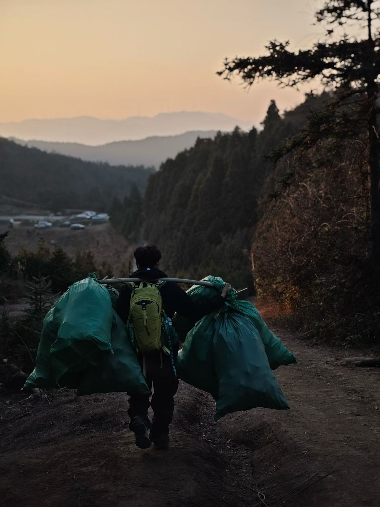 “我们有扛4袋、6袋、8袋的,还有扛12袋的大神。”左左说。为了扛起变重的垃圾,他们特制的竹竿都从细变粗。每一次下山,都是对体能的极限考验。“在加入之初,左左就告诉我,会很辛苦。”董俊杰这样告诉记者。