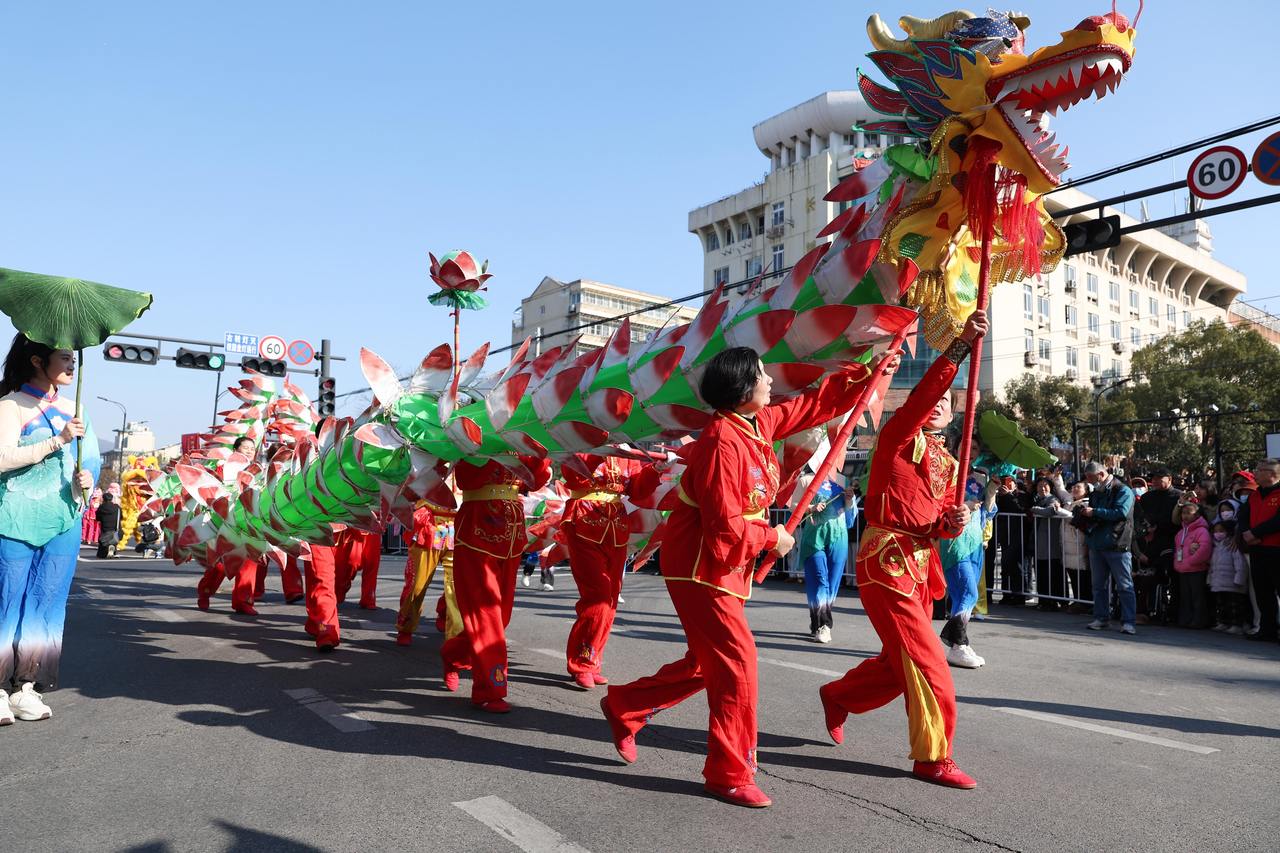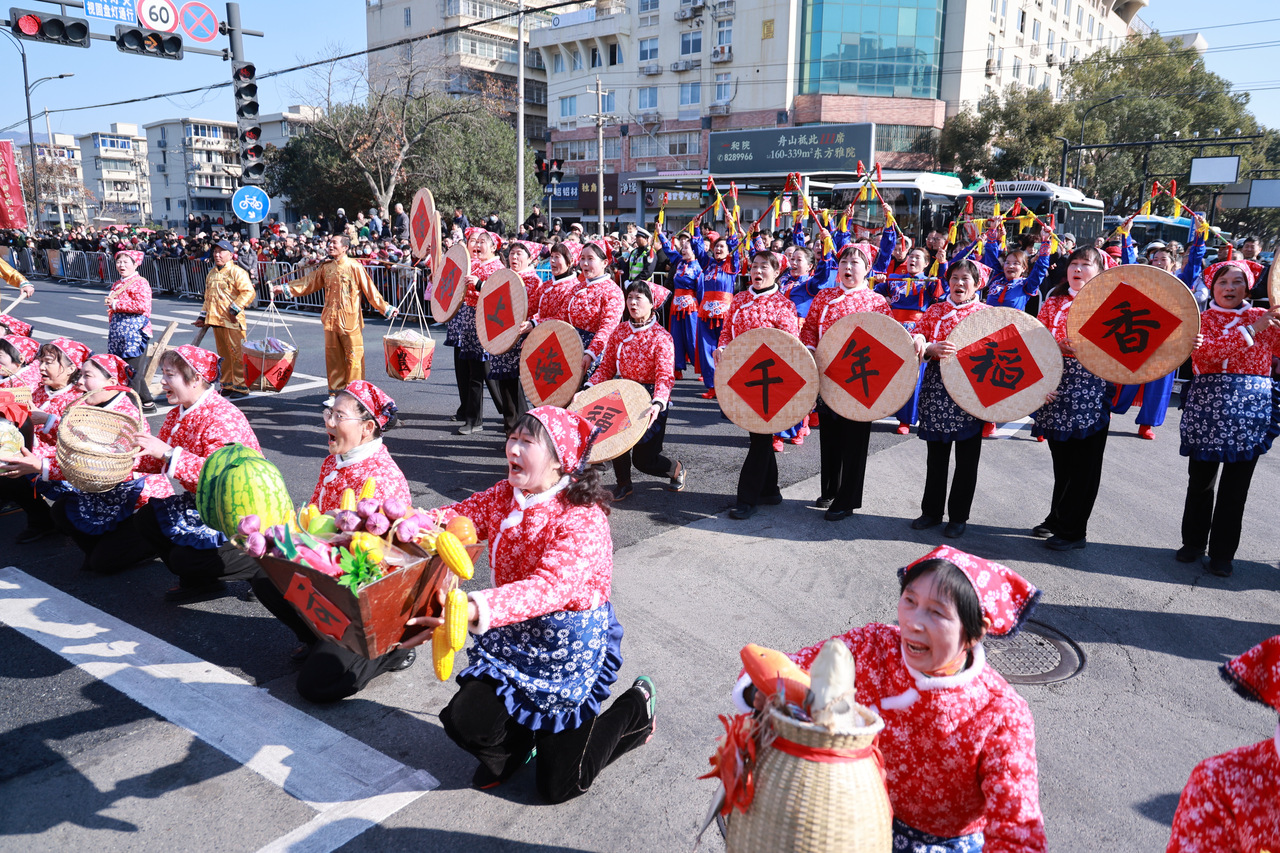 环城东路两旁,早已挤满了翘首以盼的市民。锣鼓声里,大家举着手机定格精彩瞬间,欢声笑语随着鼓点飞扬:“新年这么热闹,真是好兆头!”东城门主舞台、环城东路口展演点、海滨公园互动区遥相呼应,直播大屏实时传递着盛会的火热氛围。行进中的展演,既有乡土民俗的温情脉脉,又有时代奋斗的朝气蓬勃,生动诠释着“每个人都是定海发展的参与者,每个奋斗者都值得被看见”的城市温度。一旁的共富市集里吆喝声不断,吉祥物憨态可掬地与市民互动,非遗体验区人头攒动,让大家沉浸式触摸到民俗文化的独特魅力。