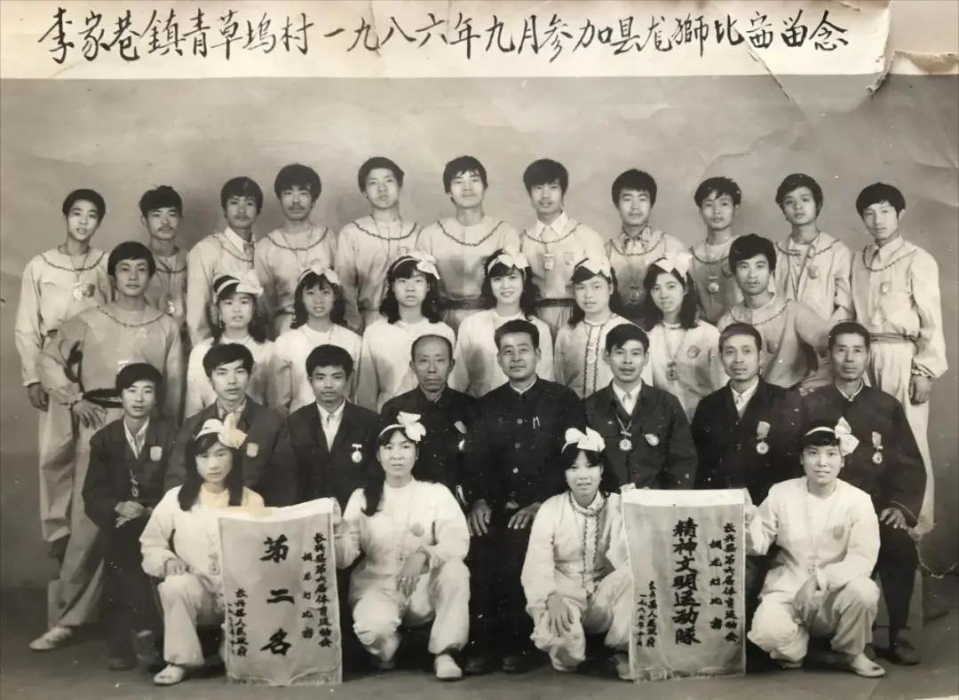 1986年9月在人民广场参加县龙狮比赛合影(陈钦招第四排左五)。图片来源:文明长兴